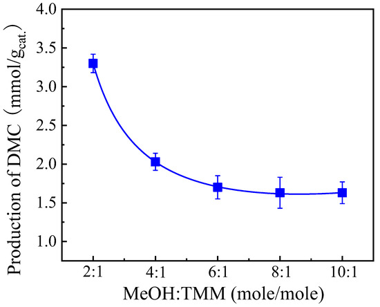 The effect of the methanol/TMM molar ratio on the DMC production on ZrO2-3 with the addition of 13X as cocatalyst has also been investigated by varying the volume of TMM added in a fixed volume of methanol solution (1 mL). It should be noted that even if a stoichiometric molar ratio of methanol and TMM of 2:1 is used, the TMM is not completely consumed at the end of the reaction, even when 13X is added as a second catalyst to promote hydration. DMC production decreased dramatically when reducing the TMM amount in the reaction medium, and finally, it reached a plateau when the molar ratio of methanol and TMM was 6:1, as shown in Figure 8. Therefore, the stoichiometric ratio of methanol and TMM is optimal and used in the following of the study, even if it has to be noted here that the presence of unconverted TMM in the reactive medium after the reaction is not desired as it must be separated from DMC by distillation, which is an energy-intensive separation method.