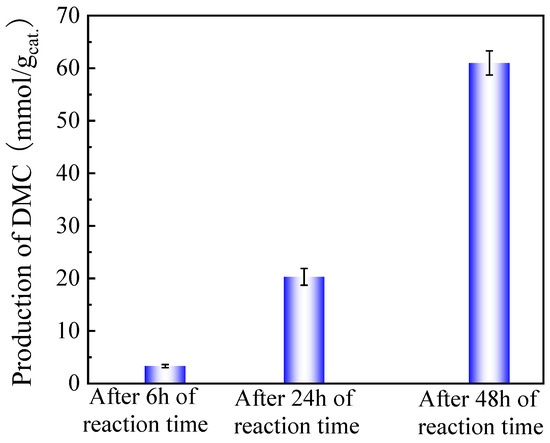The influence of the reaction time on DMC production was studied in the presence of a ZrO2-3 catalyst using 13X as a cocatalyst and TMM as a dehydration agent, as shown in Figure 9. DMC production increased remarkably with prolonged reaction time, and it arrived at a high value of 61 mmol/gcat. after 48 h of reaction, which is more than 2.5 times more than without adding 13X as a cocatalyst (see Figure 6). DMC production is therefore significantly improved on the ZrO2-3 catalyst by adding 13X as a cocatalyst to promote the hydrolysis of TMM used as a dehydration agent.