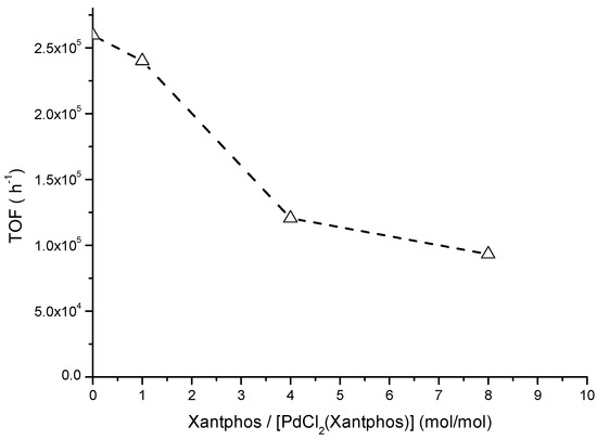 Table 1 shows an increase in TOF as a function of increasing the ligand bite angle [35,36,37]. In particular, the best result was obtained with Xantphos, which has characteristics that make it particularly interesting for application in carbonylation reactions [31,35,36,37]. Indeed, its large bite angle (110°) and its high degree of flexibility in the coordination at the metal center (97°–133°) allow it to obtain a dynamic coordination that is very important in determining the catalytic activity and selectivity. Comparing the results obtained with DPEphos (entry 7) and dppf (entry 6), which have bite angles very close to Xantphos (uncoordinated binder bite angles 108° and 106°), the results obtained are slightly inferior due to the greater stiffness of the ligand.