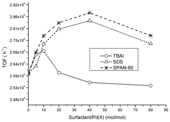 As can be observed, the best results have been obtained with the addition of SPAN–60 and SDS. The TOF passes through a maximum of ca. 285,500 h−1 at a surfactant/Pd(II) molar ratio of ca. 40/1. At higher amounts of surfactant, a slight decrease in productivity is observed, probably due to a probable reactivity of the surfactants toward the active species.