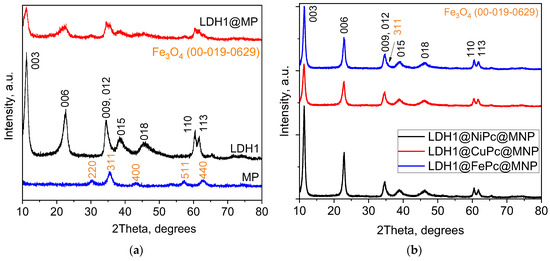 X-ray diffractograms of (a) individual magnetic nanoparticles (MNPs), MgAl LDH (LDH1), and MgAl LDH-magnetic nanoparticle composite (LDH1@MP); (b) LDH1 containing Ni, Fe, or Cu phthalocyanine (LDH1-Ni, -Fe, or -Cu) and LDH1 phthalocyanine-magnetic nanoparticle composite (LDH1-Fe-MNPs or Cu-MNPs).