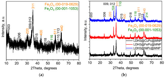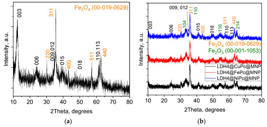 X-ray diffractograms of (a) as-prepared LDH2; (b) LDH2@Fe, Cu, or NiPc@MNP.