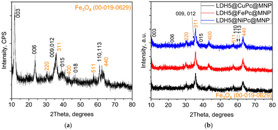 X-ray patterns obtained for magnetic particles (Fe3O4) and hydrotalcite (Mg, Al) prepared by co-precipitation and hydrotalcite (Mg, Al) deposited on magnetic particles are typical of these materials (Figure 1). The X-ray diffractograms show narrow and intense diffraction lines located at low angles of 2 theta and broad and less intense lines at high diffraction angles, with this behavior corresponding to LDH-type layered materials [13]. The diffraction lines from approximately 2θ(°)/d(Å) = 30/2.91766; 36/2.52937; 43/2.10491; 57/1.60640; and 63/1.46029 corresponding to the crystal planes (220), (311), (400), (511), and (440) of Fe3O4 are clearly observed. The diffractogram of the hydrotalcite deposited on the magnetic particles does not show other phases than those associated with the two components. As presented in the experimental section, LDHx@MPc@MNP (x = 1–5; m = Fe, Cu, Ni) represents Mg0.75Al0.25-LDH synthesized by traditional co-precipitation (LDH1), Mg0.325FeII0.325FeIII0.25-LDH (LDH2) synthesized by traditional co-precipitation, Mg0.325FeII0.325FeIII0.25-LDH synthesized by the mechanochemical method (LDH3), Mg0.325Fe0.325Al0.25-LDH synthesized by traditional co-precipitation (LDH4), or Mg0.325Fe0.325Al0.25-LDH synthesized by co-precipitation with TMAH (LDH5), on which the metallo-phthalocyanine (MPc) was drafted and attached with magnetic nanoparticles (MNPs).
