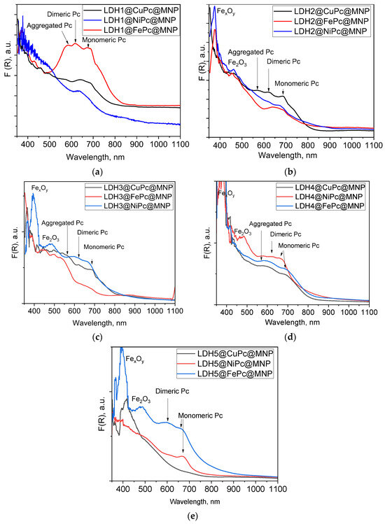 DR-UV-Vis spectra of (a) LDH1@MPc@MNP; (b) LDH2@MPc@MNP; (c) LDH3@MPc@MNP; (d) LDH4@MPc@MNP; and (e) LDH5@MPc@MNP.