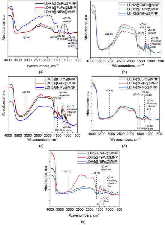 DRIFTS spectra of (a) LDH1@MPc@MNP; (b) LDH2@MPc@MNP; (c) LDH3@MPc@MNP; (d) LDH4@MPc@MNP; and (e) LDH5@MPc@MNP.