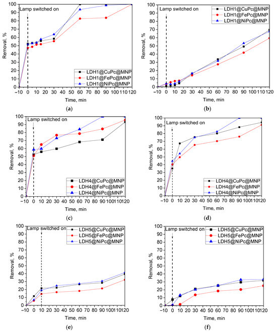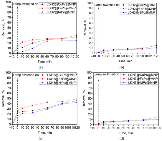 If only the photocatalytic contribution to the removal process is considered (Figure S3), it can be concluded that in this step, phthalocyanine is responsible for the performance of the composites. The degree of removal depends mainly on the amount of MPc and it does not follow the variation in the band-gap of the parent LDHs.