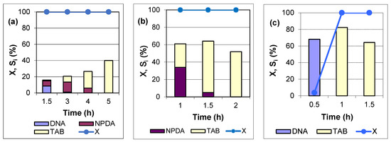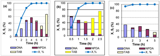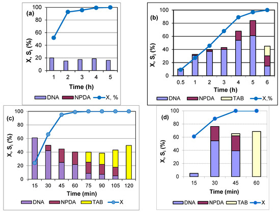 The overall selectivity to DNA+NPDA reached a highest value of 84%, and then it dropped with the TAB appearance at the complete TNB conversion, thus indicating the formation of a large amount of undetectable intermediates or condensed products (di- and trimers of TAB molecules [81]), during or after hydrogenation of the third nitro group. Similar behavior was observed for the samples with the higher Cu loading of 9–15% (Figure 3c,d).