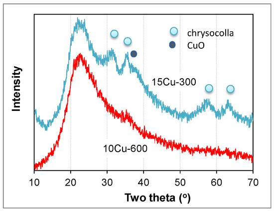 XRD patterns of the catalysts 15Cu-300 calcined at 300 °C, and 10Cu-600 calcined at 600 °C.