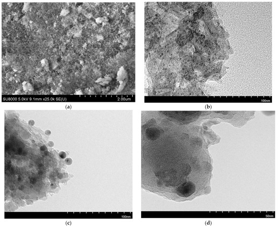 The morphology of the materials prepared was studied, and the typical selected SEM and TEM images are depicted in Figure 6 and Figure 7. The SEM images at high magnification for both the materials dried and calcined at 300 °C only (Figure 6a and Figure 7a) exhibited a uniform porous solid consisting of aggregated particles of less than 100 nm in size. In addition to these nanoparticles, lamellar structure sheets and their loose aggregates were present in the samples. Moreover, in the SEM images for the samples calcined at 300 °C, the foam-like micron-sized arrays are observed (Figure 7a). The TEM images exhibit that the arrays consist of extended needle-like shapes, and the isolated dark round spots of a size less than 4 nm are visible on their surface (Figure 7b). TEM images exhibit numerous isolated dark spots and clearly recognized crystallites of 4–25 nm in size on the surface of the SiO2 particles (Figure 6b,c and Figure 7c,d) that are presupposed to be the chrysocolla-like nanoparticles.
