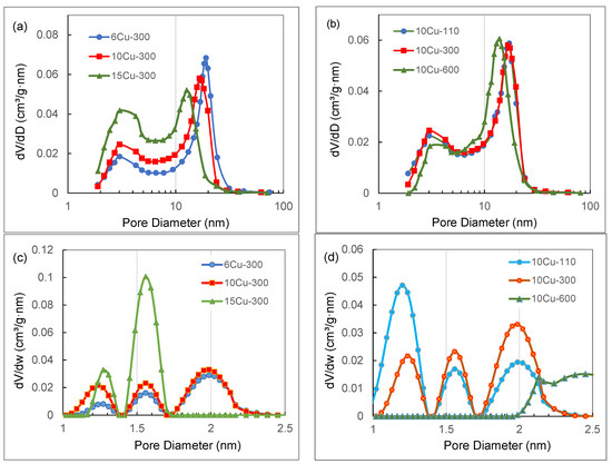 The mesopore size distribution curves (a,b) and the micropore size distribution curves (c,d) for the Cu2Si2O5(OH)2/SiO2 catalysts differed in Cu loading (a,c) and in the temperature of thermal treatment (b,d).