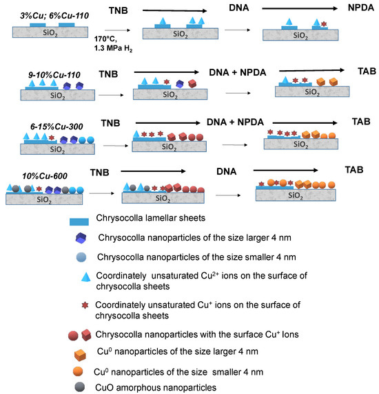 Calcination of the materials at 600 °C may result in the almost complete decomposition of the chrysocolla phase to X-ray amorphous CuO and SiO2, as was observed previously [75]. No diffraction peaks of Cu-related phases were observed after calcination at 600 °C, while the bands due to Cu phyllosilicate in FTIR spectra were still observable, with the exception of the δOH band. By this means, the numerous coordinatively unsaturated Cu2+ sites arise on the phyllosilicate surface, forming grain boundaries with highly dispersed CuO species. Such structures seem to possess extremely high catalytic activity in hydrogenation of nitro groups in TNB.