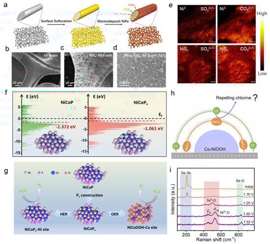 Protection of anode current collectors. (a) Schematic drawing of the fabrication process; (b–d) SEM images of untreated nickel foam, NiSx formed on nickel foam, and electrodeposited NiFe on the NiSx surface; (e) TOF-SIMS mapping of SOx2−/1− and CO32−/1− fragments from a Ni3 and NiSx/Ni electrode surface after activation in 1 M KOH + 0.5 M NaCl at 400 mA/cm2. Negative TOF-SIMS counts were collected from m/z = 96/48/80/40 (SO4−/SO42−/SO3−/SO32−) and 60/30 (CO3−/CO32−) after Ar plasma milling for 5 to 15 min to clean the surface adsorbed electrolytes (scale bars: 10 μm); (f) The total DOS of NiCoP and NiCoPv; (g) Schematic representation of the genuine phases and active sites of NiCoPv in 1.0 M KOH + seawater electrolyte during HER and OER; (h) The schematic illustration of the reconstruction of Co-NiSe2 to generate Co-NiOOH and SeO42− SCL on the surface; (i) In situ Raman of Co-NiSe2 under initial, 1.10, 1.25, 1.40, and 1.55 V.