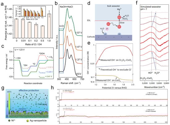 The proposed Lewis acid layer effectively traps and enriches hydroxyl anions and modulates the charge and pH on the catalyst surface, providing more favorable conditions for the adsorption and dissociation of water molecules [63]. Since OH− and Cl− are the primary anions in seawater, the accumulation of excess OH− on the anode surface reduces the amount of Cl−. This occurs because OH− and Cl− compete for adsorption sites on the electrode surface, with more OH− preventing Cl− from approaching the electrode surface. Using the IrOx−-modified rotating ring disk electrode technique, the authors found that the pH of the Cr2O3-CoOx surface increased with applied potential, then initially increased and subsequently decreased with current density. In contrast, the pH of the CoOx surface was lower than seawater (~7.9) and decreased with increasing current density (Figure 4e). Even at anodic potentials as high as 1.90 V vs. RHE, the OH− concentration on the Cr2O3-CoOx surface remained significantly higher than the theoretically required excess OH− concentration, suggesting that the OH− generated on the surface of Cr2O3-CoOx is sufficient to inhibit the migration of Cl− from seawater to the electrode surface [64,65]. These results clearly demonstrate the Cr2O3 layer’s ability to successfully generate localized alkalinity on the catalyst surface. The article used in situ surface-enhanced infrared reflectance (IR) spectroscopy to probe the formation mechanism of locally generated OH− on the anode surface in natural seawater. For CoOx, the band at 3460 cm−1 was assigned to adsorbed water molecules (H2O*), which did not shift significantly with varying applied voltage. However, for Cr2O3-CoOx, the H2O band continued to shift toward the OH band when the applied potential varied from 1.0 V vs. RHE to 1.8 V vs. RHE (Figure 4f), suggesting that the localized OH− generated arises from the dissociation of adsorbed water molecules on Cr2O3 [66,67,68].