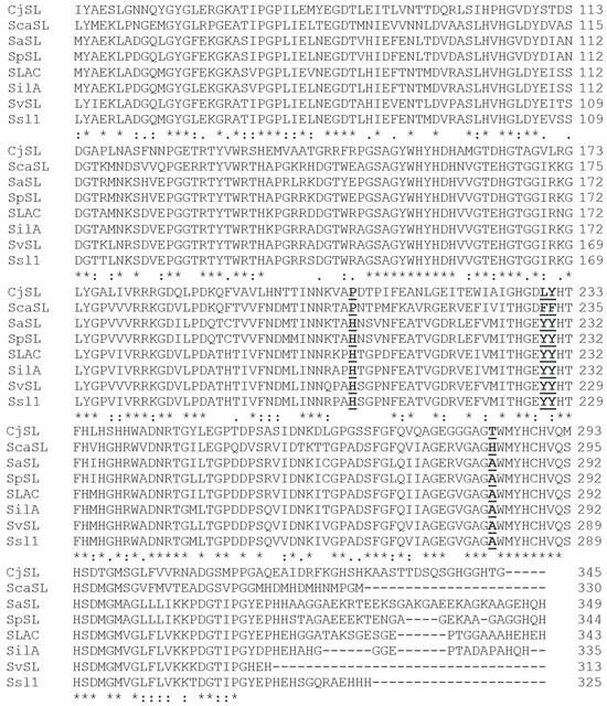 Sequence alignment of SvSL and CjSL with low-potential laccases. Homologous amino acid residues are highlighted with dots, identical ones with asterisks.