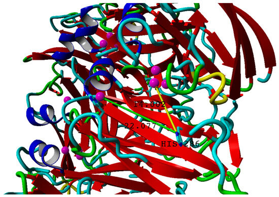 Laccase from Streptomyces carpinensis, His 286 with distances from the imidazole group to T1 copper atom (green arrow) and to T2/T3 copper atom (yellow arrow). Substitution to alanine leads to loss of such a long-range interaction.