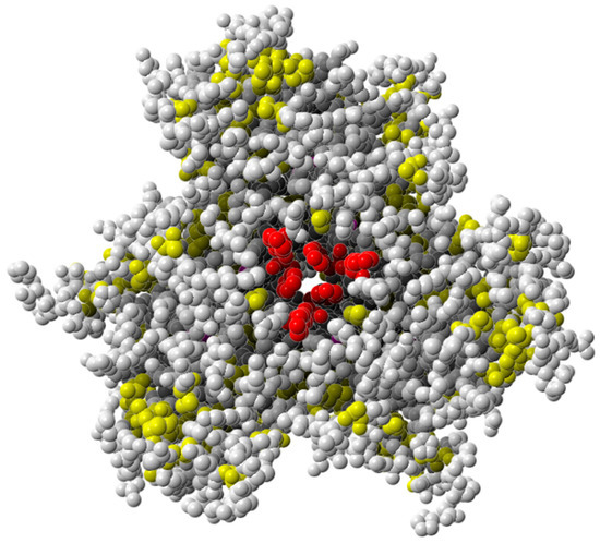 Localization of residues F232–F233 in the trimer of ScaSL laccase (red spheres). Hydrophobic residues are shown as yellow spheres. Copper atoms are shown as magenta spheres.