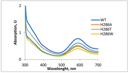 E. coli cells carrying a vector with ScaSL mutant genes produced laccases H286A, H286T, and F232Y/F233Y with high yields (more than 100 mg per 1 L of culture). However, the yield of laccase H286W was lower, about 40–50 mg per liter of medium. All purified laccases had a distinctive blue color and were obtained in a homogeneous state.
