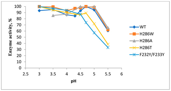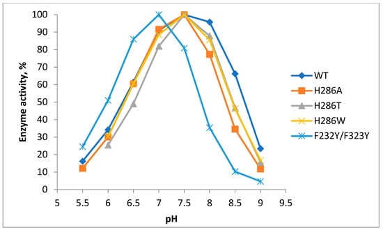 It was found that the mutant laccases H286A and H286W, like the wild-type laccase, oxidized a non-phenolic organic compound ABTS at the maximum rate in the pH range of 4.5–5.0. However, laccases H286T and F232Y/F233Y oxidized ABTS with a maximum rate at pH 3.0–4.0 (Figure 5). The mutants H286A, H286T, and H286W, like the wild-type laccase, oxidized the phenolic compound 2,6-DMP with a maximum rate at pH 7.5. Conversely, the mutant F232Y/F233Y showed the highest oxidation rate at pH 7.0 (Figure 6).