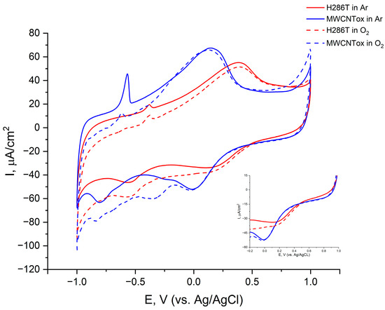 Graphite rod electrodes (GREs) and pencil graphite electrodes (PGEs) [25] were used to study bioelectrocatalytic oxygen reduction in the presence of laccases, the surface of which had been modified with MWCNTox, as described in [26]. Enzymes were applied to the end surface of the electrodes. Figure 7 shows the voltammograms of glass–carbon electrodes modified with MWCNTox and the mutant H286T laccase.