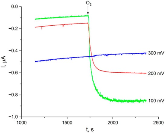 DET is thermodynamically feasible when the redox potential of laccase is higher than the potential applied to the electrode [27,28]. The potential at which the oxygen reduction current is not observed can be considered the redox potential of laccase under these conditions. To determine the value of laccase’s redox potential, the chronoamperometry method was used, which has recently made it possible to characterize CjSL laccase as a medium-potential oxidase [26]. Figure 8 shows the chronoamperometric curves of the laccase mutant H286T/MWCNTox modified electrode at different potentials.