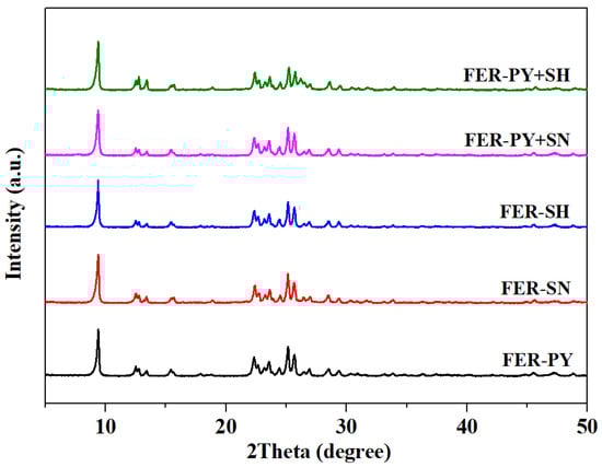 As shown in Figure 1, XRD patterns of FER-PY, FER-SN, FER-SH, FER-PY+SN, and FER-PY+SH exhibit typical diffraction peaks at 9.3°, 22.3°, 23.5°, 24.3°, 25.2°, 25.7°, and 28.5° out of the (200), (321), (330), (112), (040), (202), and (312) crystal planes in the FER topology (PDF #44-0104), respectively, indicating the successful formation of the FER zeolite without detectable impurities [,]. The relative crystallinity (RC) was calculated by integrating the areas of diffraction peaks within 9.3-28.5°, and the sum of the areas of FER-PY was set as 100% for reference. As listed in Table 1, the calculated RC values are comparable, measuring 101%, 99%, 100%, and 101% for FER-SN, FER-SH, FER-PY+SN, and FER-PY+SH, respectively. The above results indicate that several templates, such as PY, SN, SH, PY+SN, and PY+SH, can induce the synthesis of well-crystallized FER zeolites. The composition information is listed in Table 1, where the SiO2 to Al2O3 ratios (SARs) of the five samples are within 24.6–25.6. Additionally, the Na2O contents are all below 43 mg/g, suggesting that all FER-X samples have similar compositions and acidic densities. The calculated texture parameters are shown in Table 1; in line with the XRD observations, the specific surfaces and pore volumes remain relatively uniform, for instance, the values of SBET average around 430 m2/g, while Vtotal and Vmicro are all about 0.27 cm3/g and 0.14 cm3/g, respectively.