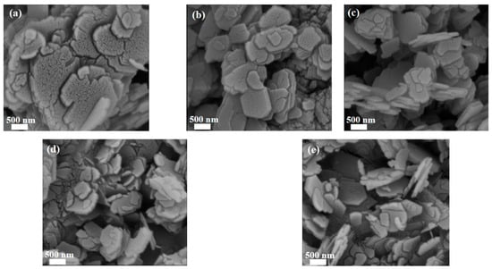 The SEM images (Figure 2) present the morphologies of the obtained FER-X zeolites. All samples are composed of hexagonal flake-like crystals with smooth surfaces; the average size of each flake is ~1 μm in length, ~500 nm in width, and 20~50 nm in thickness. Combined XRD and SEM analyses indicate that their morphology and structure are identical.