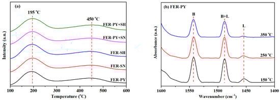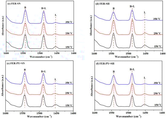The acidic properties were characterized using NH3-TPD and Py-IR. As illustrated in Figure 3, two NH3 desorption peaks are observed at 195 °C and 450 °C (Figure 3a), corresponding to the desorption of NH3 molecules that interact with the weak acids and strong acids, respectively. The positions of these peaks provide insight into acid strength, indicating that the weak and strong acid sites in FER-X samples exhibit similar acidic densities. Figure 3b–f shows the Py-IR spectrum was extracted at 150 °C, 250 °C, and 350 °C. The IR adsorption peak at 1450 cm−1 corresponds to the C-N stretching of pyridine adsorbed on LAS, while the peak at 1490 cm−1 is attributed to the C-H vibration of pyridine on both BAS and LAS. The peak at 1540 cm−1 is due to the N-H stretching of pyridinium cations generated by protonation of pyridine on BAS. As shown in Figure 3b–f, with the increase in desorption temperature, both BAS and LAS in the sample decrease. When the desorption temperature reaches 350 °C, LAS decreases to a very low level, indicating a scarcity of strong LAS in the FER-X samples. In contrast, the decrease in BAS is considerably smaller, indicating a stronger acidity of BAS present in the FER-X samples.