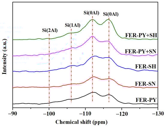 The 29Si MAS NMR spectra show closely similar features (Figure 4), exhibiting four sub-peaks from the curve at approximately −100, −107, −112, and −116 ppm, respectively. The peaks at −100 and −107 ppm correspond to the Si atoms bonded to two Al atoms (Si(2Al)) and one Al atom (Si(1Al)), respectively, while the peaks at −112 and −116 ppm can be attributed to the Si atoms that are not adjacent any Al atoms (Si(0Al)), and silicon connecting to four Si tetrahedrons in the FER framework [,]. The weaker signal at −100 ppm of all samples indicates a lower prevalence of Al–O–Si–O–Al species on FER-X zeolites.