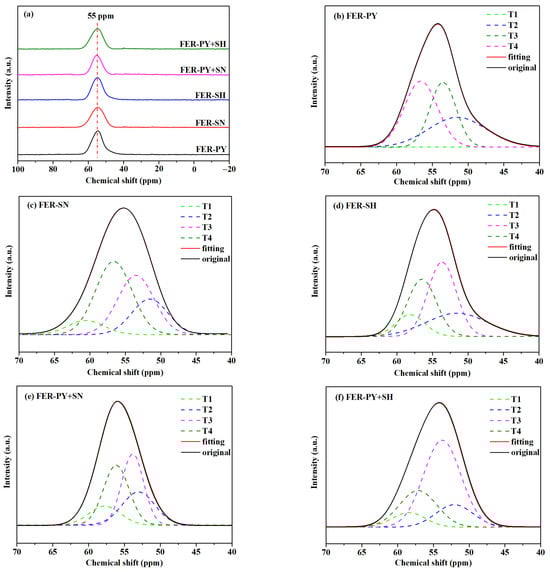 The 27Al MAS NMR spectra of various FER-X zeolites are shown in Figure 5. As shown in Figure 5a, all of the FER-X samples exhibit a prominent resonance peak at 55 ppm corresponding to tetrahedrally coordinated Al species, while no signal peak appears at 0 ppm. This indicates that the aluminum atoms in zeolites samples are located on the framework of FER-X zeolites, and there is no non-framework aluminum present [,,]. Previous studies have shown that aluminum atoms exhibit different NMR chemical shifts depending on their positions of T1, T2, T3, and T4 within the FER framework [,,], and the 27Al MAS NMR spectrum at 55 ppm is deconvolved into four peaks located at 61, 51, 53, and 58 ppm, respectively, as illustrated in Figure 5b–f. The Al population at T1–T4 sites in the FER-X samples was quantified from the corresponding 27Al NMR spectra (Figure 5b–f) and Table 3. The FER-PY sample exhibited a minimal fraction of Al atoms on the T1 + T3 sites (30%). In comparison, the distribution proportion of aluminum on the T1 + T3 positions in FER-SN, FER-SH, and FER-PY+SN gradually increased to 41%, 44%, and 50% respectively, while the distribution proportion of aluminum at T1 + T3 positions on FER-PY+SN reached the highest value of 60%. Notably, each of the five samples contained a small amount of Al on the T1 site (0~12%).