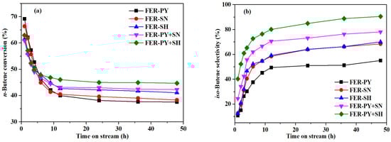 In contrast, the selectivity of isobutene showed a completely reversed trend from that in Figure 7b. In the initial stage, the selectivity over FER-PY, FER-SN, and FER-SH was below 20%, while FER-PY+SN and FER-PY+SH recorded 25% and 40%, respectively. With the extension of time on stream, the selectivity over FER-PY gradually increased to ~55% after 48 h. FER-SN and FER-SH both presented a sharp increase in the first 12 h and then kept steady, with the selectivity reaching ~63% at 48 h. The selectivity over FER-PY+SN and FER-PY+SH also presented a sharp increase in the first 12 h, leveling off at about 78% and 90% after 48 h, respectively.