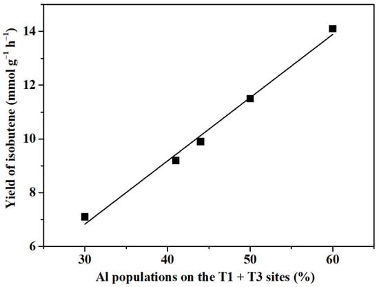 Relationship between yield of isobutene and Al populations on the T1 + T3 sites.