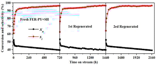 Figure 9 displays the long-term stability tests using FER-PY+SH as candidate catalysts. The catalytic results were obtained with three cycles of regeneration (2160 h). The one-way life of the catalyst reaches 720 h, the conversion of n-butene (xn) is greater than 39%, the selectivity of isobutene (si) is greater than 95%, and the yield of isobutene is greater than 37.5%. After 720 h of continuous reaction, the conversion of n-butene was below 39%, and catalyst regeneration was carried out at this time. After stopping the reaction, all deactivated catalysts were placed in a muffle furnace and the temperature was raised at a rate of 1 °C/min from 30 °C to 500 °C, and calcined at 500 °C for 12 h to complete the regeneration of the deactivated catalysts. Interestingly, after 720 h of one-way operation, the activity of FER-PY+SH in skeletal isomerization of n-butene was fully recovered after regeneration. This finding substantiates that FER-PY+SH can be effectively reused, thereby extending its lifespan beyond most reported catalysts in the skeletal isomerization of n-butene. The catalyst of FER-PY+SH exhibits superior catalytic activity due to its unique distribution of framework aluminum and enhanced acidic strength in the 10-MR.