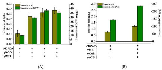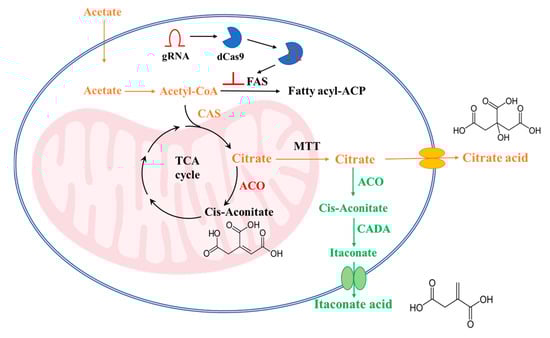 The traditional production of high-value chemicals mainly relies on petrochemical raw materials. With the depletion of petrochemical resources and the environmental pollution caused by the chemical synthesis method, we hope to develop a green and sustainable way to replace the chemical conversion route [1]. It is considered a viable alternative to produce high-value biochemicals via microbial cell factories using renewable feedstocks [2]. Citric acid is a commonly used food acidifier and preservation agent in the food industry, which can reduce the heat resistance of microorganisms and inhibit their growth to prevent food decomposition [3]. As a preferable additive, citric acid also has broad application in the production of chelating agents and detergents, animal feeds, lubricants, and plasticizers [4]. In addition, citric acid is a precursor for the microbial synthesis of itaconic acid via the functions of aconitase (ACO) and cis-aconitate decarboxylase (CADA) [5]. Itaconic acid, as one of the top twelve platform compounds, is an important unsaturated five-carbon dicarboxylic acid [6,7]. It can be used to produce a variety of derivatives, including diols, isomeric lactones, cyclic ethers, and so on. In particular, as a component of resins, elastomers, plastics, and adhesives in the polymer industry, itaconic acid has a potential market demand as high as 3.2 million tons [8]. Currently, the production of citric acid and itaconic acid mainly relies on the fermentation of starch-based raw materials by filamentous fungi (Aspergillus niger and Aspergillus terreus) [9]. However, the cultivation of filamentous fungi has some issues including difficulties in morphology control, laborious handling of spores, high oxygen demand, low reproducibility of fermentation, and complex genetic background [3,5].