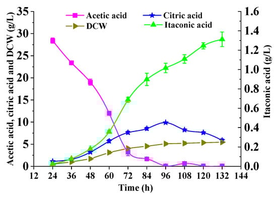Even though the itaconic acid synthesis pathway was enhanced, it still had a lower production compared to the results from the engineered Y. lipolytica in previous work [34]. One of the reasons is possibly the genetic differences between different types of Y. lipolytica, which leads to the production capacity varying greatly [15,34]. In addition, it was found that the titer of citric acid reached 3.2 g/L, which is suspected to be due to the fact that the synthesis of citric acid was limited in the glucose-YNB (CSM-Leu) medium and negatively affected the synthesis of itaconic acid. According to our results above, acetate is an available carbon source for the efficient accumulation of citric acid, which is thus considered a potential substrate for itaconic acid synthesis.