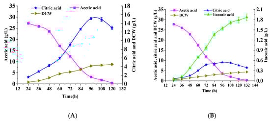 Cell growth was monitored by measuring the optical density at 600 nm (OD600), which could also be converted to dry cell weight (DCW) according to the calibration curve DCW: OD600 = 0.33:1 (g/L). After being centrifuged at 13,200× g for 5 min, the supernatant of the fermentation broth was analyzed for the concentrations of citric acid, itaconic acid, glucose, and acetic acid using the Aminex HPX-87H organic acid column (25 cm × 0.4 cm, Bio-Rad, Hercules, CA, USA). Citric acid, itaconic acid, and acetic acid were detected by a UV detector at a wavelength of 210 nm, while glucose was detected by a refractive index detector. The column was eluted with 5 mM H2SO4 with a flow rate of 0.6 mL/min at a column temperature of 50 °C, and the temperature of the refractive index detector was also set to 50 °C.