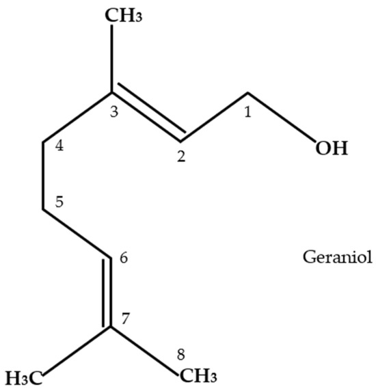 - Chen, W.; Viljoen, A.M. Geraniol—A review of a commercially important fragrance material. S. Afr. J. Bot. 2010, 76, 643–651. [Google Scholar] [CrossRef]