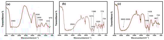 The presence of a broad band at 3300–3600 cm−1 is attributed to water in the sheets of NiAl-LDH or the stretching frequencies of the -OH groups in the LDH layers. A smaller vibrational stretch at 1630 cm−1 is due to H2O molecules bending regions in the interlayers of NiAl-LDH []. The spectrum of LDH primarily consists of three regions: a band at 1400 cm−1 indicating the vibrations of NO3− ions in the interlayers, a weak band at 1600 cm−1 showing carbonate anions acting as interlayer anions, and small bands at 810 cm−1, 671 cm−1, and 433 cm−1 corresponding to metal vibrations, such as M-O and M-OH vibrations within the LDH lattice [].