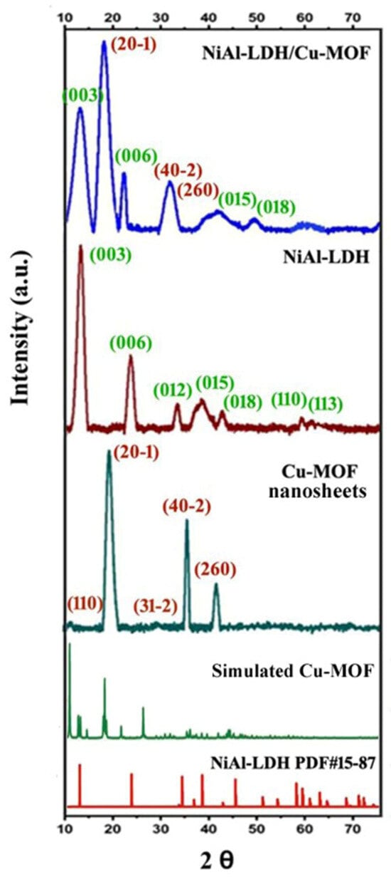 PXRD patterns of Cu-MOF, NiAl-LDH, and NiAl-LDH/Cu-MOF composite.
