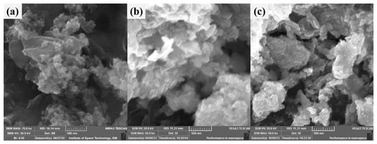 Figure 3 shows an SEM image surface displaying the morphology of NiAl-LDH, Cu-MOF, and NiAl-LDH/Cu-MOF composite. Cu-MOF grains are present as small aggregates on the NiAl-LDH layers. The -OH groups on NiAl-LDH sheet’s surface facilitate the directed attachment of Cu-MOF through heterogeneous nucleation, leading to the organized growth of individual Cu-MOF grains on the NiAl-LDH surface of the adsorbent []. Additionally, the positively charged metal sites on the NiAl-LDH surface can provide binding sites for in situ nucleation and guide the growth of Cu-MOFs due to their unsaturated coordination state [].