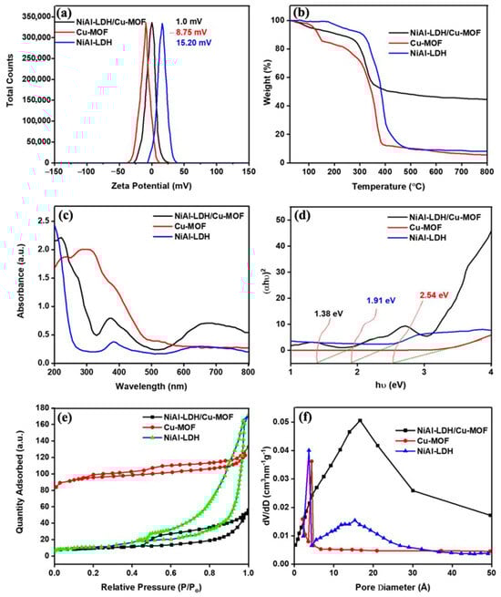 (a) Zeta potential, (b) TGA, (c) DRS, (d) Tauc plot, (e) N2 adsorption–desorption isotherm, and (f) BJH pore size of NiAl-LDH/Cu-MOF composite, Cu-MOF, and NiAl-LDH catalysts.