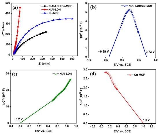 (a) The EIS curves of NiAl-LDH/Cu-MOF, NiAl-LDH, and Cu-MOF and (b–d) Mott–Schottky plots of NiAl-LDH/Cu-MOF, NiAl-LDH, and Cu-MOF.