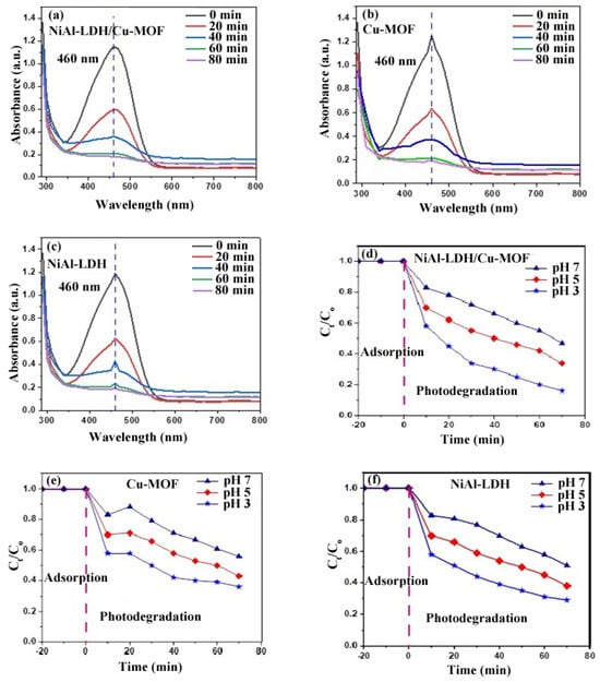 (a–c) UV–Vis spectra showing the degradation of MO dye by NiAl-LDH/Cu-MOF, Cu-MOF, and NiAl-LDH and (d–f) photocatalytic degradation of MO at pH 3, 5, and 7 by NiAl-LDH/Cu-MOF, Cu-MOF, and NiAl-LDH.
