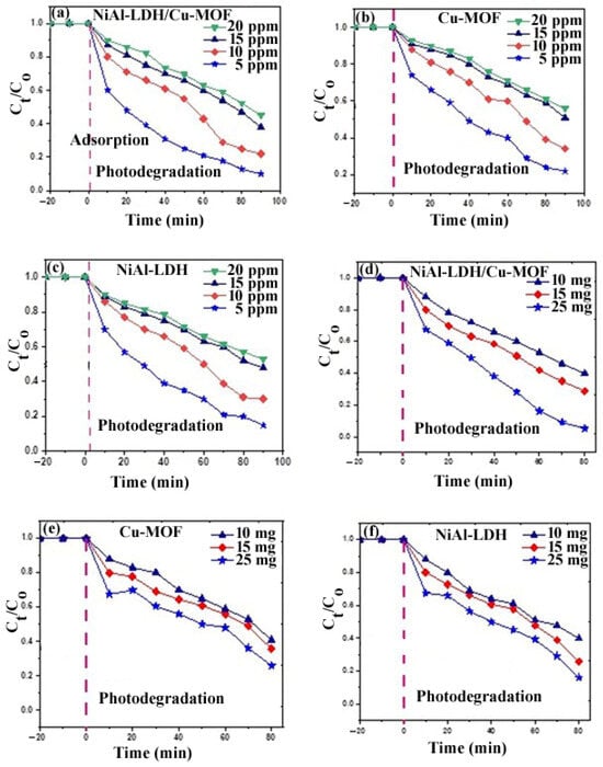 In the experiment, the photocatalyst dose was fixed at 25 mg. The dye concentration was 5, 10, 15, and 20 ppm, maintaining a constant time of 80 min, as shown in Figure 8a–c. In the dark or before sunlight irradiation, no changes were found in MO dye concentration after the addition of the NiAl-LDH/Cu-MOF composite, Cu-MOF, and NiAl-LDH and the color of the dye does not change, which means that adsorption efficiency is very low or almost zero []. However, after irradiation with sunlight, the NiAl-LDH/Cu-MOF composite exhibits maximum degradation efficiency compared to Cu-MOF and NiAl-LDH at 5 ppm MO dye concentration. Degradation efficiency decreased with increasing dye dosage, which may be attributed to a reduction in the number of available sites on the photocatalyst for MO dye degradation []. This decrease in degradation efficiency with higher dye concentrations could also be attributed to more dye particles competing for the limited sites [].