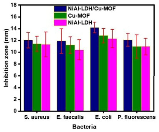 Antibacterial activity of NiAl-LDH/Cu-MOF composite, Cu-MOF, and NiAl-LDH catalyst.