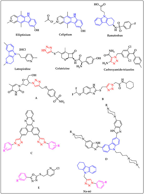 Carbazole derivatives have previously been reported as anticancer agents; for example, Elliptinium, which was reported as a topoisomerase II inhibitor and an intercalating agent [20]. Preclinical and phase II clinical evaluations revealed that Elliptinium (Figure 1) exhibits efficacy against breast and renal cell carcinomas and both small- and non-small-cell lung cancer [21]. Elliptinium analog Celiptium (N-methyl-9-hydroxy ellipticinium acetate) has been developed and used for the treatment of metastatic breast cancer [22]. Similarly, many of the triazoles are reported as anticancer agents that target various cellular pathways in cancer development and progression [23,24,25,26,27]. Cefatrizine and Carboxyamido-triazole have been reported as potential anticancer drugs [28,29] and substituted triazole heterocycles could serve as telomerase inhibitors.