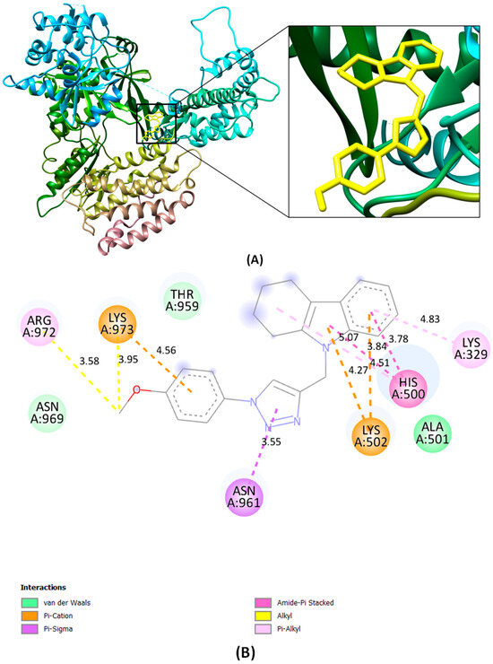 Computational techniques were employed to evaluate the binding affinity and interactions of novel compound 5g with TERT (Figure 3). The molecular docking simulations yielded a binding energy of –6.74 kcal/mol for the interaction between 5g and TERT. This negative binding energy suggests a favorable binding interaction between the compound and the protein, indicating that 5g may be a potential TERT inhibitor. Analysis of the docking results revealed several critical interactions between 5g and TERT. Notable interactions included o π-cation bond forming with LYS-503 and LYS-973 and having bond distances of 4.27 Å and 4.57 Å, respectively, of TERT: hydrophobic interactions (π-sigma, Amide π-stacked, alkyl, and π-alkyl) were also observed at the binding site with residues LYS-329, HIS-500, ASN-961, and ARG-972. These interactions are indicative of the compound’s ability to interact with, and potentially inhibit, TERT function. These findings predict that compound 5g may be a candidate for the targeting of TERT.