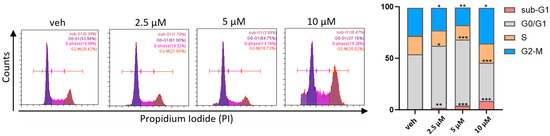Effects of compound 5g on cell cycle progression in MCF-7 cells: MCF-7 cells were treated with the compound at the indicated concentrations for 48 h and harvested for cell cycle analysis. The percentage (%) of the cell cycle phase is quantified. Data are presented in the histograms as means ± SD. * p < 0.05, ** p < 0.01, *** p < 0.005, **** p < 0.0001, two-way ANOVA, compared with no treatment control.