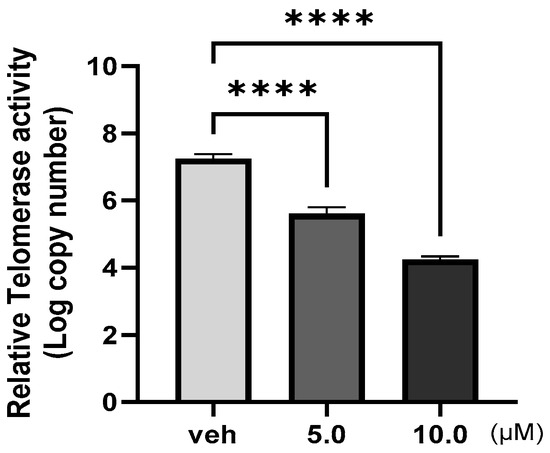 Telomeres are oligonucleotide sequences (TTAGGG) present at the ends of chromosomes and exert critical functions in limiting cell replication [1]. With each cell division, the telomere length decreases, and the telomeres signal to activate telomerase. Telomerase is an enzyme complex that lengthens telomeres and is composed of telomerase reverse transcriptase (TERT), telomerase RNA (TERC), and dyskerin [2,3]. TERT extends telomeric repeats at the ends of chromosomes using TERC as its template. This process aids in maintaining genetic stability and cellular health in some cell types, such as stem cells [4]. Cells reach a state known as cellular senescence or apoptosis when the telomeres are sufficiently shortened, preventing further cell division and functioning as a natural barrier to unchecked cell proliferation. Numerous studies have reported the inhibition of telomerase by small molecules in various cancer cells [5,6,7].