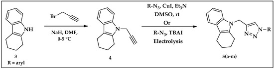 Synthesis of tetrahydrocarbazole–triazole 5(a–m) derivatives.