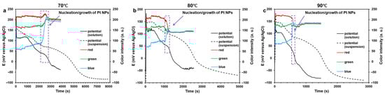 - Danilenko, M.V.; Guterman, V.E.; Vetrova, E.V.; Metelitsa, A.V.; Paperzh, K.O.; Pankov, I.V.; Safronenko, O.I. Nucleation/Growth of the Platinum Nanoparticles under the Liquid Phase Synthesis. Colloids Surf. A Physicochem. Eng. Asp. 2021, 630, 127525. [Google Scholar] [CrossRef]